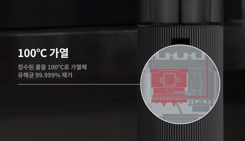 2단계) 정수된 물을 가열수조에서 100도로 가열하여 고온 살균하는 과정입니다. 이를 통해 유해균인 황색포도상구균, 폐렴간균, 녹농균 등이 99.999% 감소됩니다.