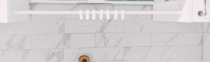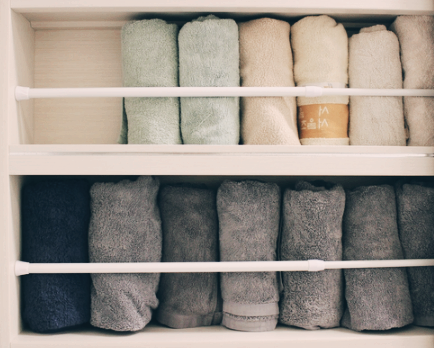 욕실에 수건을 넣어놓으면 자꾸 떨어질 때 압축봉 최고입니다. 수건을 개서 깔끔하게 봉 안 쪽으로 넣어 고정합니다. 압축봉 하나 설치하면 깔끔해집니다.