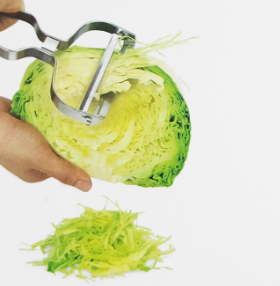 양배추 채칼은 잎사귀 쪽의 뭉툭한 부분을 한 손으로 잡고, 나머지 한 손으로 마치 감자채칼을 사용하듯 그대로 사용하시면 됩니다.아래 그림을 참고하세요.