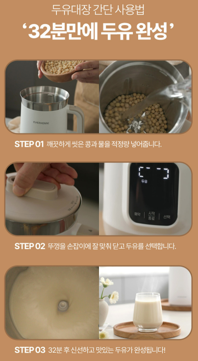 - 시중에서 판매되는 두유와 달리 신선하고 첨가물이 없는 순수한 두유를 집에서 간편하게 만들 수 있습니다.